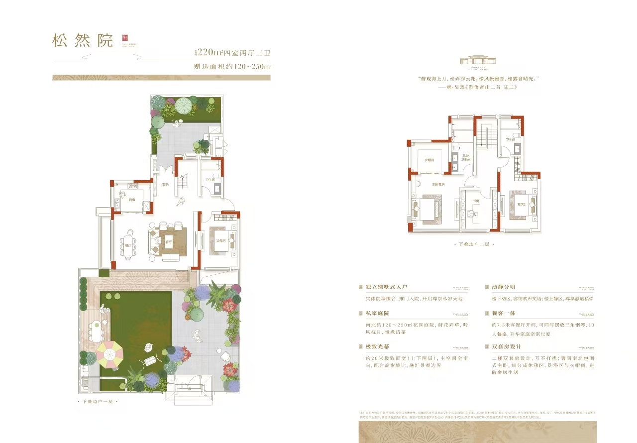 第一个超大赠送院墅:上叠坐拥约100㎡露台 + 14㎡设备平台 + 30㎡北庭院,下叠尊享户均约200㎡南北双庭院+百变地下室,拓展生活无限可能;